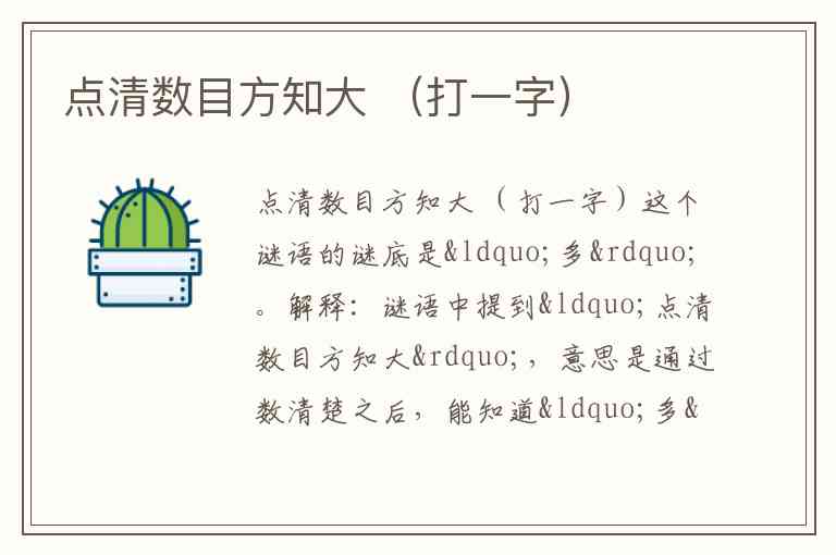 解释:谜语中提到“点清数目方知大”,意思是通过数清楚之后,能知道“多”字的含义。通过“点”字数目后,便会得出“多”的意思。