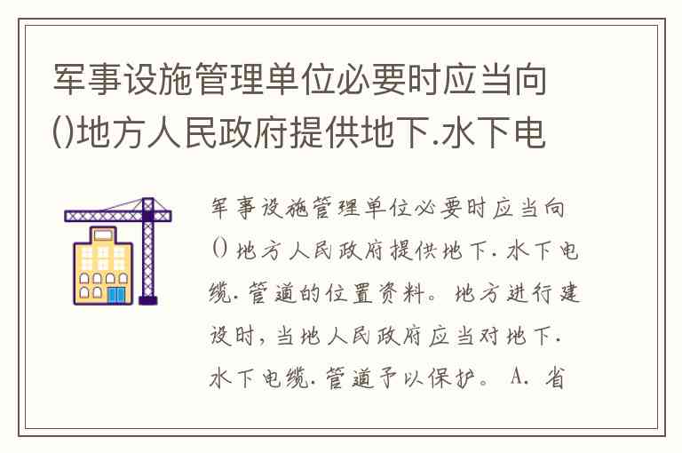 军事设施管理单位必要时应当向()地方人民政府提供地下.水下电缆.管道的位置资料。地方进行建设时,当地人民政府应当对地下.水下电缆.管道予以保护。 A. 省级 B. 市级 C. 县级 D. 县级以上