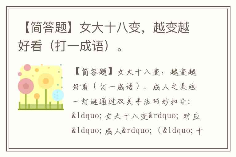 从灯谜技巧看,它运用了“分扣法”:将谜面拆为“女大十八(变)”和“越变越好看”两段,分别对应“成人”与“之美”。类似的双关灯谜还有“愚公之家(打一成语)——开门见山”,均通过语义联想实现巧妙转化。