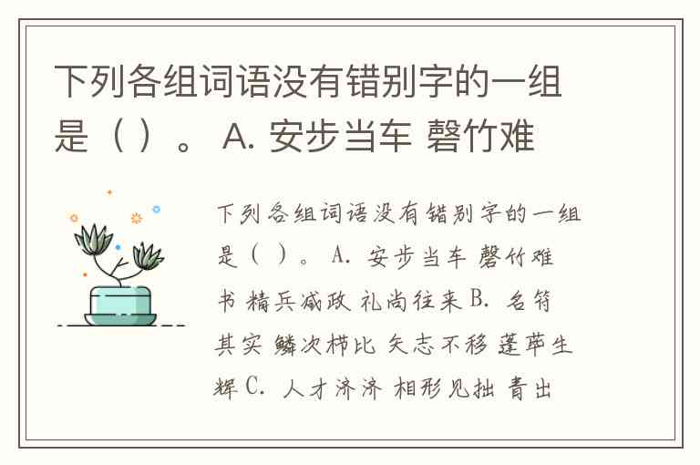 下列各组词语没有错别字的一组是( )。 A. 安步当车 磬竹难书 精兵减政 礼尚往来 B. 名符其实 鳞次栉比 矢志不移 蓬荜生辉 C. 人才济济 相形见拙 青出于蓝嗷嗷待哺 D. 不负众望 不刊之论 对簿公堂 功亏一篑