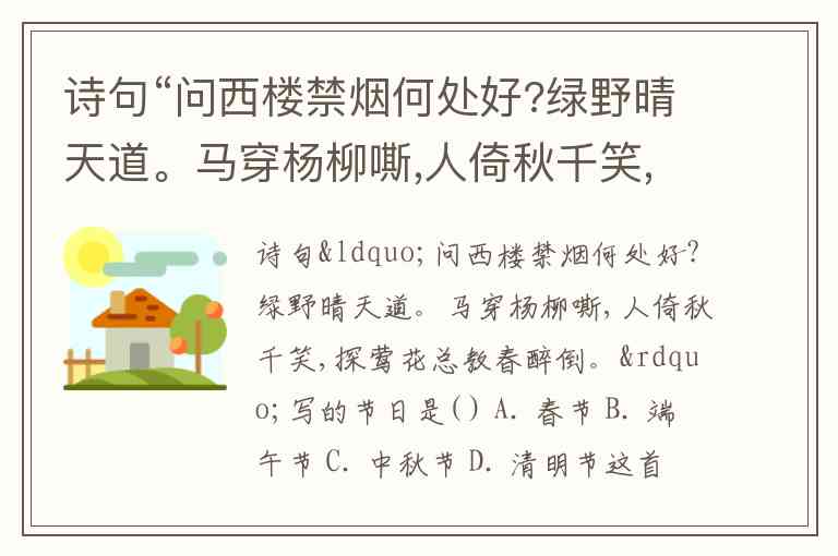 诗句“问西楼禁烟何处好?绿野晴天道。马穿杨柳嘶,人倚秋千笑,探莺花总教春醉倒。”写的节日是( ) A. 春节 B. 端午节 C. 中秋节 D. 清明节
