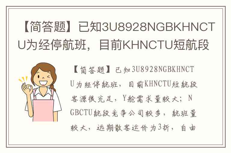 【简答题】已知3U8928NGBKHNCTU为经停航班,目前KHNCTU短航段客源很充足,Y舱需求量较大;NGBCTU航段竞争公司较多,航班量较大,远期散客运价为3折,自由竞争、自由销售;NGBKHN段客源不饱和,为了确保航班收益则NGBCTU和KHNCTU运价应遵循怎样的对应关系?为什么?