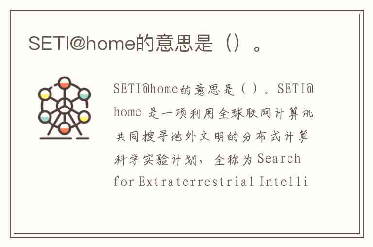 SETI@home 是一项利用全球联网计算机共同搜寻地外文明的分布式计算科学实验计划,全称为 Search for Extraterrestrial Intelligence at Home(在家中探索外星文明)。该项目由美国加州大学伯克利分校创立,中心平台位于伯克利空间科学实验室,1999年5月正式启动,旨在通过分析射电望远镜采集的无线电信号,寻找地外智能生命存在的证据。