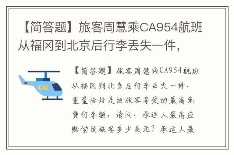 【简答题】旅客周慧乘CA954航班从福冈到北京后行李丢失一件,重量恰好是该旅客享受的最高免费行李额,请问,承运人最高应赔偿该旅客多少美元?