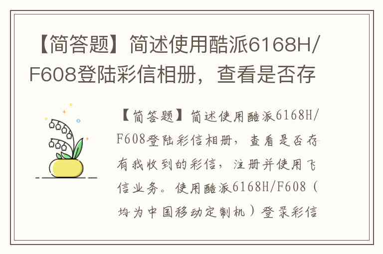 【简答题】简述使用酷派6168H/F608登陆彩信相册,查看是否存有我收到的彩信,注册并使用飞信业务。