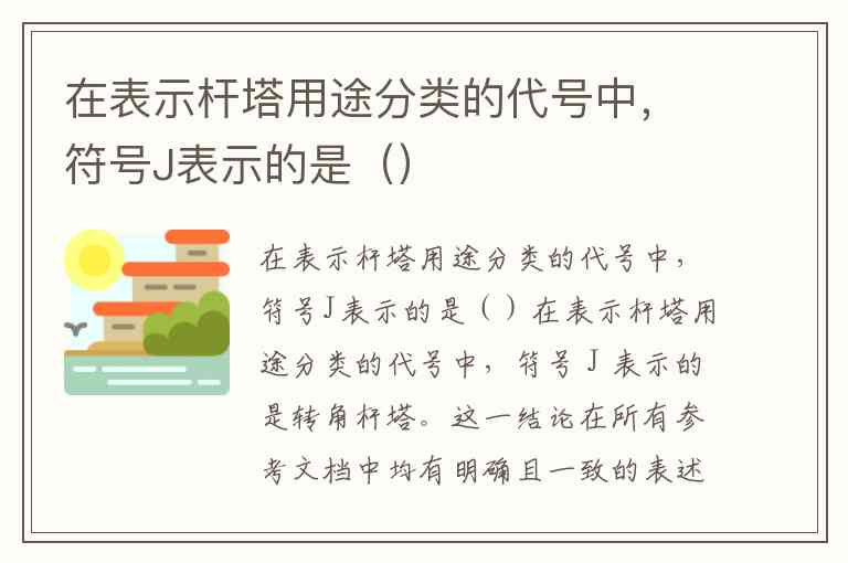 这一结论在所有参考文档中均有明确且一致的表述。例如,文档[3][6][8]均指出:“转角杆塔:用于线路转角地点,分直线转角和耐张转角2种。用符号‘J’表示转角杆塔。” 文档[4][5][7]则在杆塔用途代号列表中直接标注“J—转角杆塔”,与直线杆塔(Z)、耐张杆塔(N)、终端杆塔(D)等共同构成完整的分类体系[5][7]。