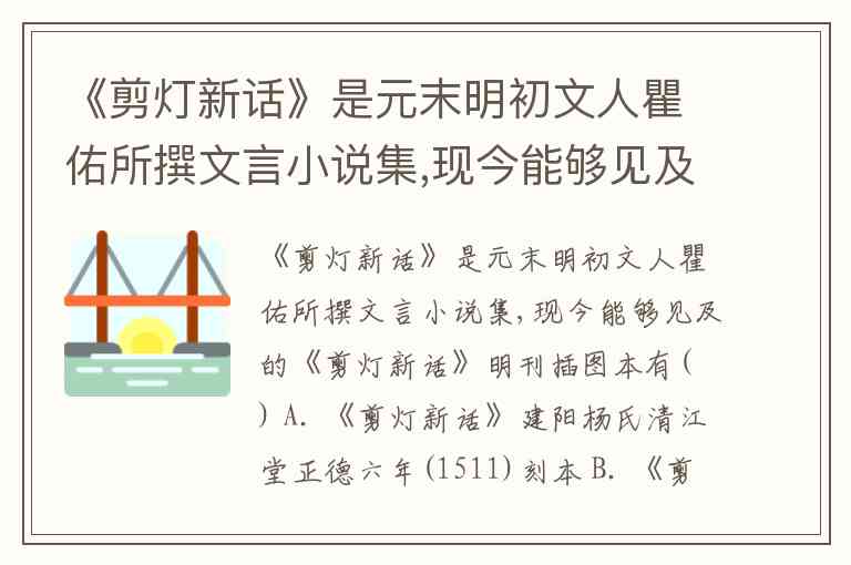 《剪灯新话》是元末明初文人瞿佑所撰文言小说集,现今能够见及的《剪灯新话》明刊插图本有( ) A. 《剪灯新话》建阳杨氏清江堂正德六年(1511)刻本 B. 《剪灯新话》徽州黄正位刊本 C. 洪武初年传抄本 D. 瞿暹刻本