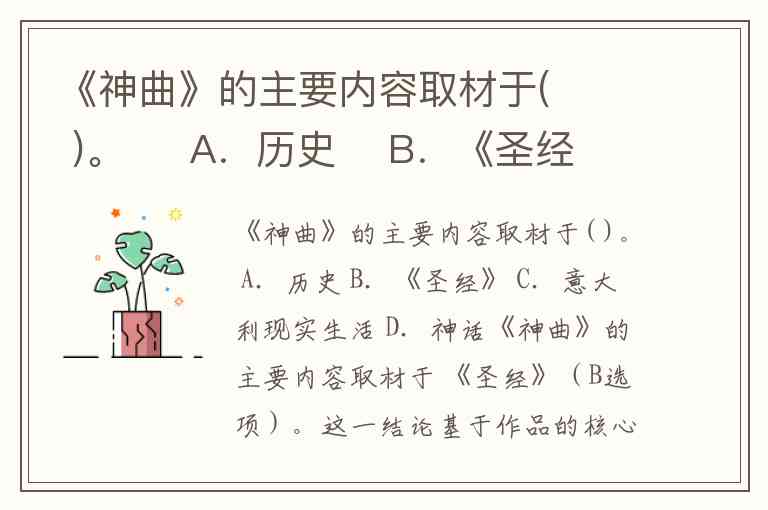 《神曲》的主要内容取材于 《圣经》(B选项)。这一结论基于作品的核心框架、神学体系与象征结构的深度分析: