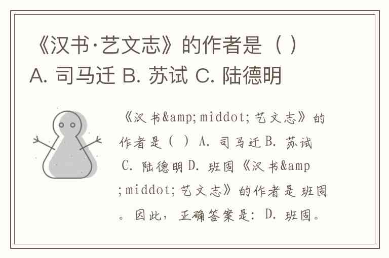 《汉书·艺文志》的作者是( ) A. 司马迁 B. 苏试 C. 陆德明 D. 班固