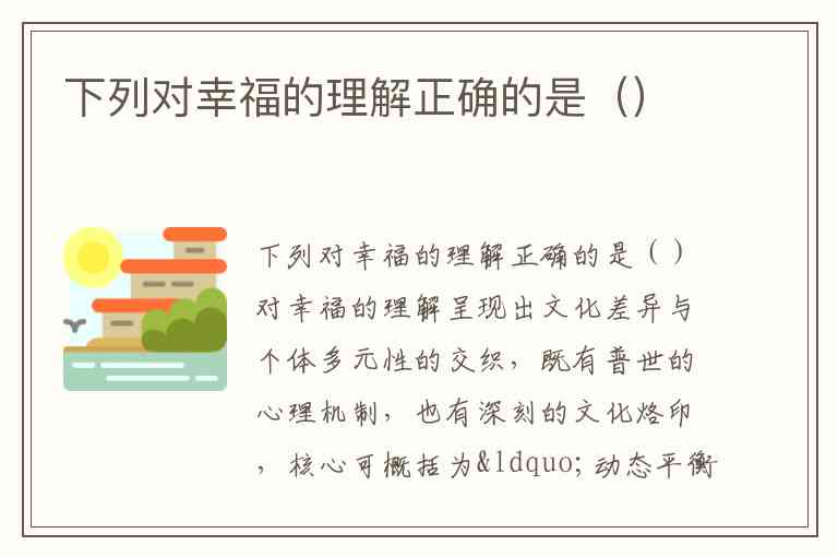 对幸福的理解呈现出文化差异与个体多元性的交织,既有普世的心理机制,也有深刻的文化烙印,核心可概括为“动态平衡的身心体验与价值实现”。