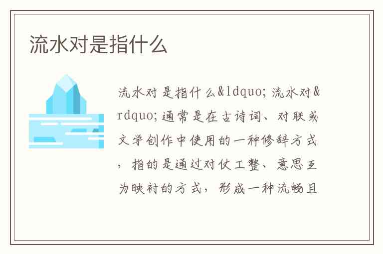 简而言之,“流水对”指的是结构对仗、句子和谐且有连贯性,像流水一样流畅的文学表达。
