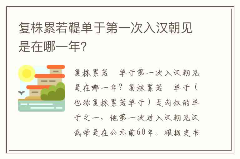 复株累若鞮单于(也称复株累若单于)是匈奴的单于之一,他第一次进入汉朝见汉武帝是在公元前60年。根据史书记载,复株累若单于在这一年受汉武帝的邀请,作为匈奴的代表来到长安(今西安),举行了正式的朝觐仪式。