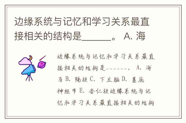 边缘系统与记忆和学习关系最直接相关的结构是______。 A. 海马 B. 隔核 C. 下丘脑 D. 基底神经节 E. 杏仁核