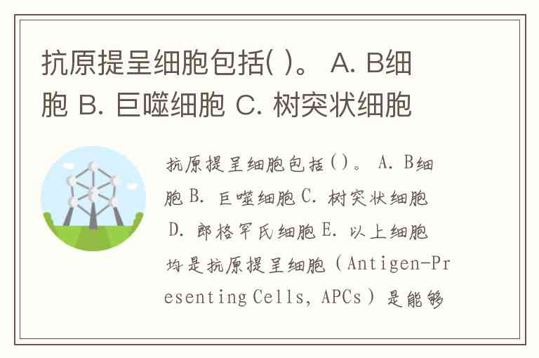 抗原提呈细胞包括( )。 A. B细胞 B. 巨噬细胞 C. 树突状细胞 D. 郎格罕氏细胞 E. 以上细胞均是