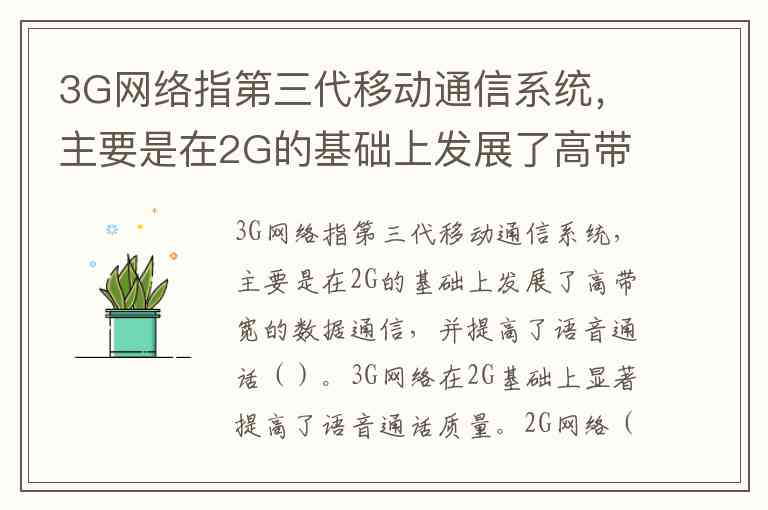 3G网络指第三代移动通信系统,主要是在2G的基础上发展了高带宽的数据通信,并提高了语音通话()。
