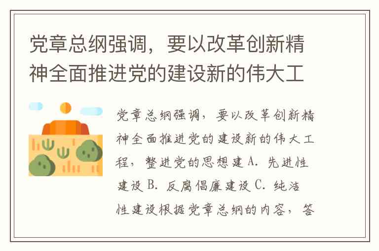 党章总纲强调,要以改革创新精神全面推进党的建设新的伟大工程,整进党的思想建 A. 先进性建设 B. 反腐倡廉建设 C. 纯洁性建设