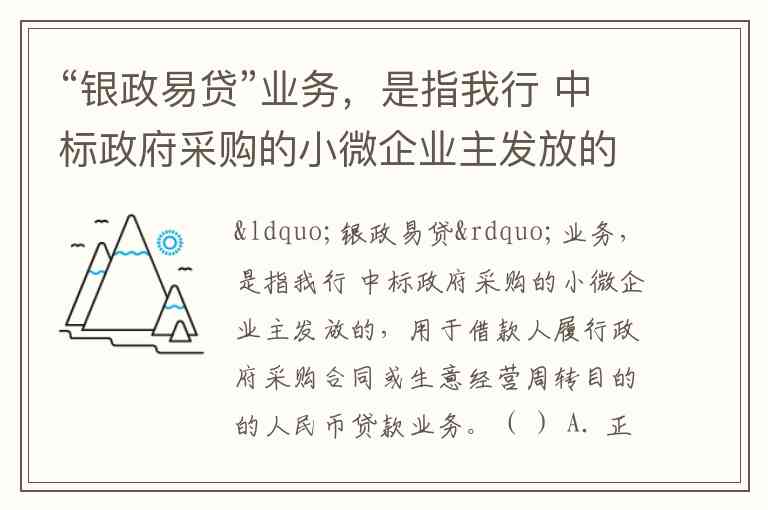 “银政易贷”业务,是指我行 中标政府采购的小微企业主发放的,用于借款人履行政府采购合同或生意经营周转目的的人民币贷款业务。( ) A. 正确 B. 错误