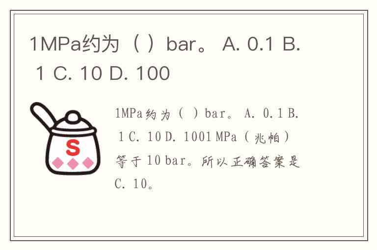 1MPa约为( )bar。 A. 0.1 B. 1 C. 10 D. 100