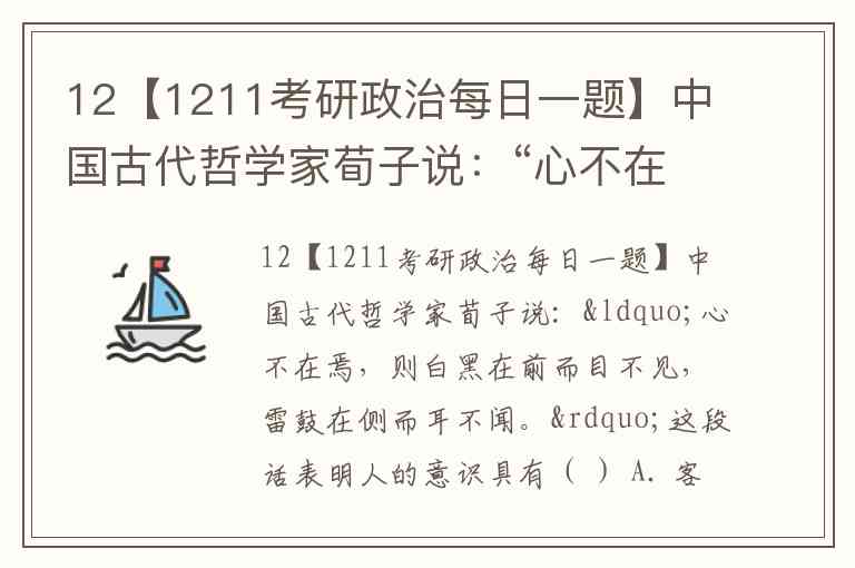 12【1211考研政治每日一题】中国古代哲学家荀子说:“心不在焉,则白黑在前而目不见,雷鼓在侧而耳不闻。”这段话表明人的意识具有( ) A. 客观性 B. 能动性 C. 对象性 D. 任意性