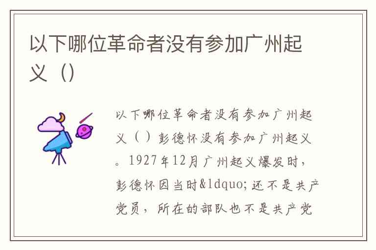 从广州起义的主要领导者和参与者名单来看,叶挺任总指挥、叶剑英任副总指挥,聂荣臻负责军委工作,徐向前率领工人赤卫队第六联队参战。而陈延年等革命者因牺牲时间(1927年7月)早于起义爆发(12月),也未参与其中。这些史实表明,广州起义的领导核心以广东及南方党组织成员为主,而彭德怀当时的政治身份和军事活动区域均与起义无关。