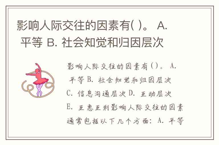 影响人际交往的因素有( )。 A. 平等 B. 社会知觉和归因层次 C. 信息沟通层次 D. 互动层次 E. 互惠互利