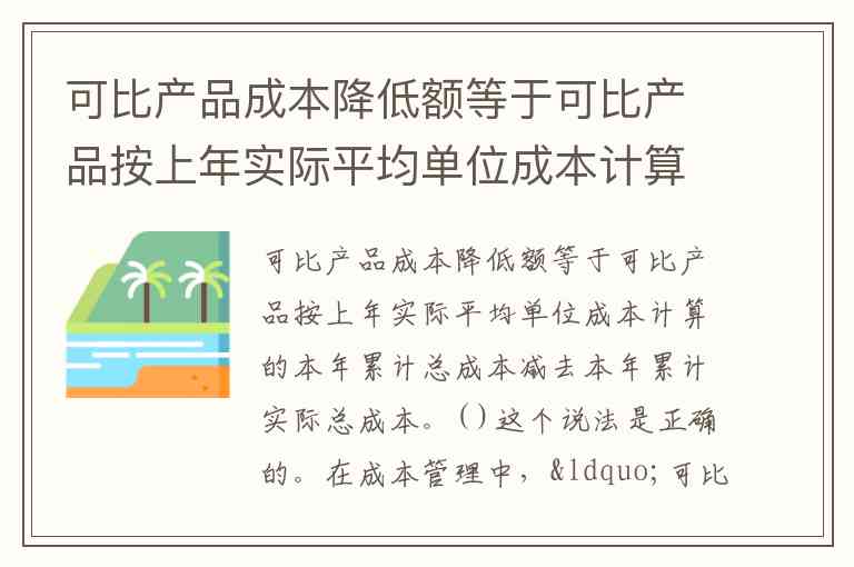 在成本管理中,“可比产品成本降低额”通常指的是通过某些管理措施、生产效率提高、材料采购优化等手段,使得产品成本在本年度相比上年度有所下降。其计算方法是: