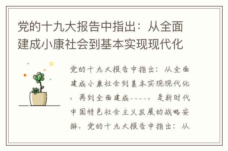 党的十九大报告中指出:从全面建成小康社会到基本实现现代化,再到全面建成社会主义现代化强国,是新时代中国特色社会主义发展的战略安排。