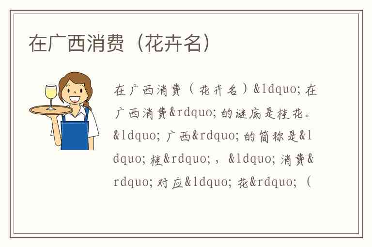 “广西”的简称是“桂”,“消费”对应“花”(花费),二者组合即“桂花”。这一谜语巧妙利用了地名简称与动词的双关——“桂”既指广西,“花”既表消费行为,又暗合花卉名称。