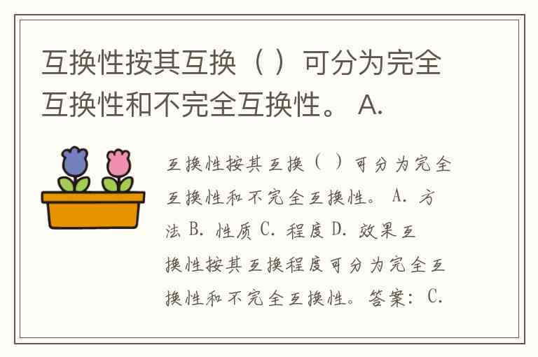 互换性按其互换( )可分为完全互换性和不完全互换性。 A. 方法 B. 性质 C. 程度 D. 效果