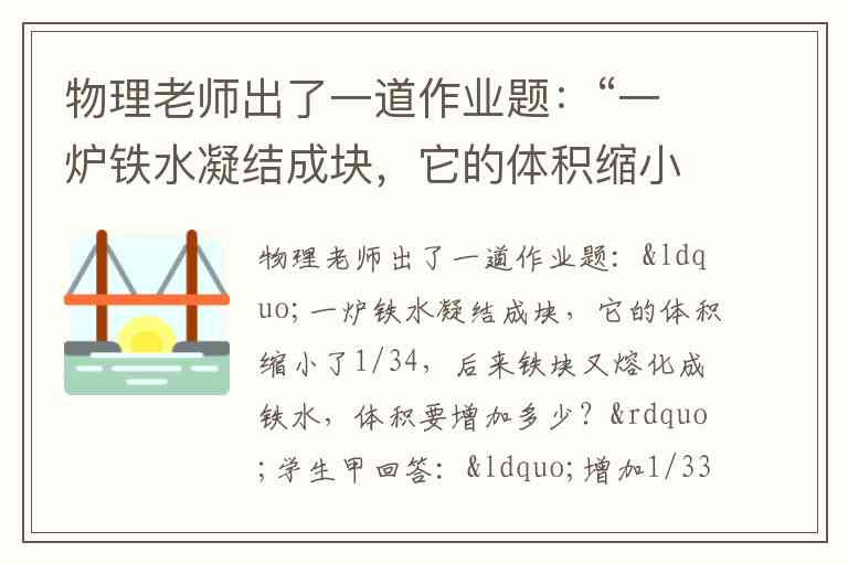 铁水凝结成铁块时,是将铁水体积视为基准量(设为34份),缩小的1/34是铁水体积的1/34,因此铁块体积为 份;