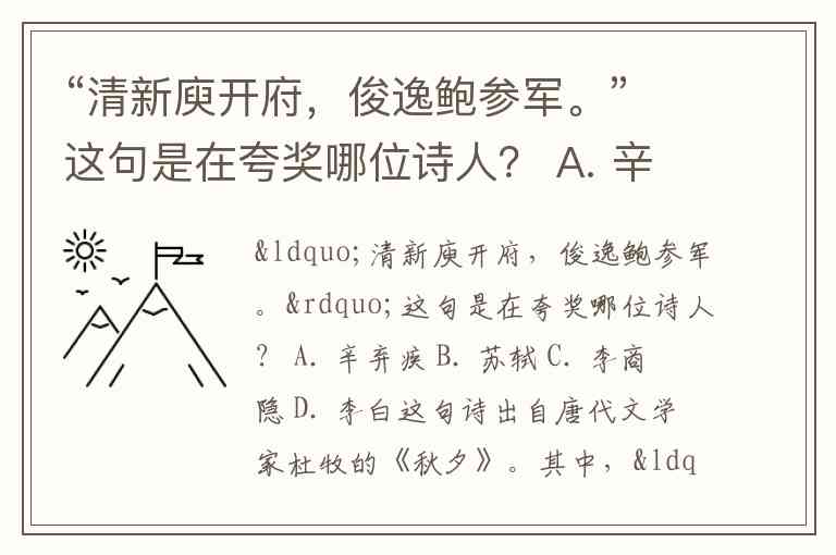“清新庾开府,俊逸鲍参军。”这句是在夸奖哪位诗人? A. 辛弃疾 B. 苏轼 C. 李商隐 D. 李白