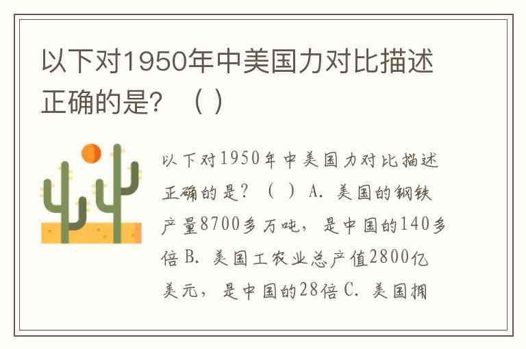 以下对1950年中美国力对比描述正确的是?( ) A. 美国的钢铁产量8700多万吨,是中国的140多倍 B. 美国工农业总产值2800亿美元,是中国的28倍 C. 美国拥有原子弹和世界上最先进的常规武器装备 D. 美国实行的是陆、海、空军立体作战,中国军队以步兵和少量炮兵为主,更无从谈起制空权与制海权