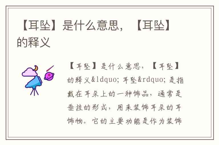 “耳坠”是指戴在耳朵上的一种饰品,通常是垂挂的形式,用来装饰耳朵的耳饰物。它的主要功能是作为装饰,增添佩戴者的美丽和气质。耳坠的种类很多,材质可以是金属、宝石、珍珠、木材、塑料等,设计上也有很多变化,可以根据个人的喜好、场合需求来选择。