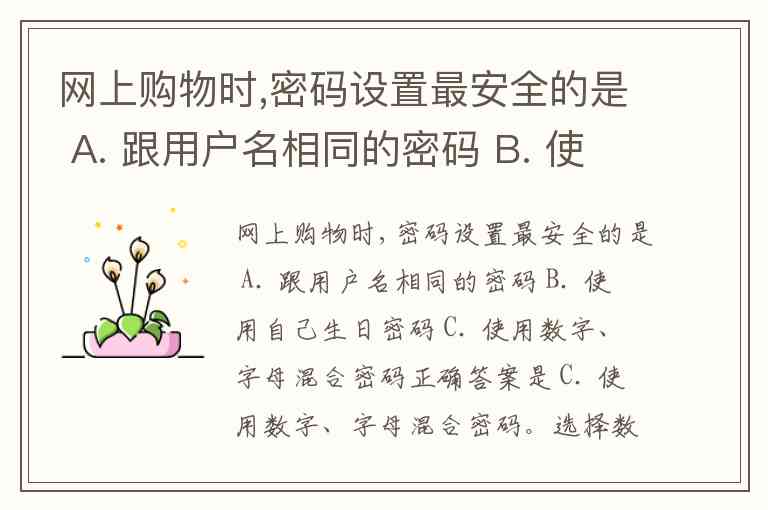 网上购物时,密码设置最安全的是 A. 跟用户名相同的密码 B. 使用自己生日密码 C. 使用数字、字母混合密码