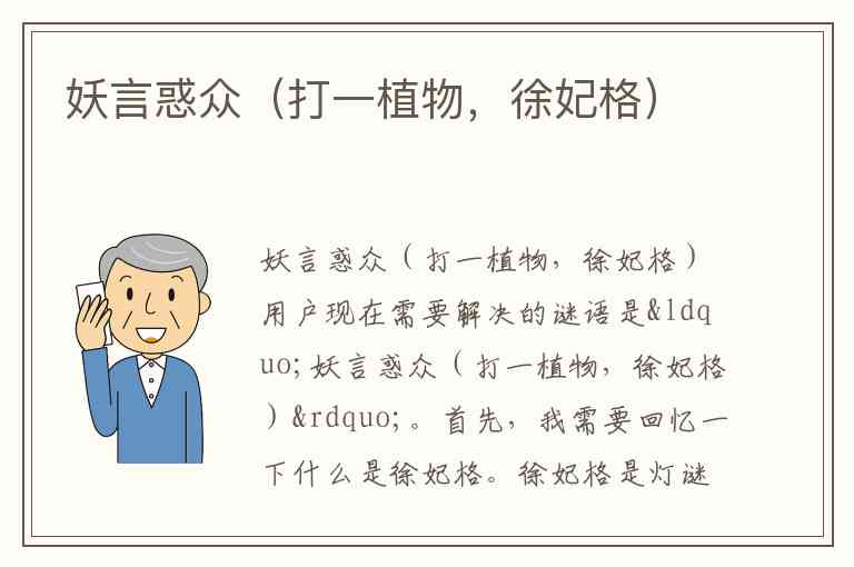 用户现在需要解决的谜语是“妖言惑众(打一植物,徐妃格)”。首先,我需要回忆一下什么是徐妃格。徐妃格是灯谜的一种格法,通常要求谜底的字都带有相同的偏旁部首,并且去掉这些偏旁后,剩下的部分能扣合谜面的意思。