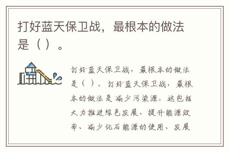 打好蓝天保卫战,最根本的做法是 减少污染源。这包括大力推进绿色发展、提升能源效率、减少化石能源的使用、发展清洁能源、加强工业和交通排放的监管等。通过从源头上减少污染物的排放,才能有效改善空气质量,保护蓝天。