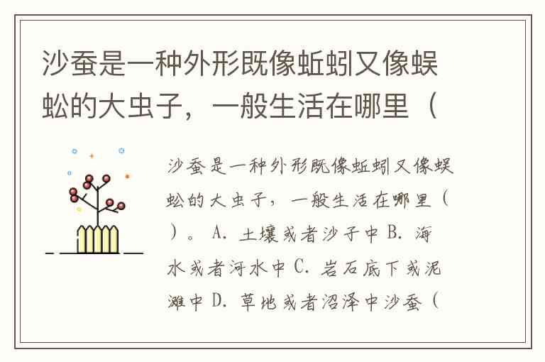 沙蚕是一种外形既像蚯蚓又像蜈蚣的大虫子,一般生活在哪里()。 A. 土壤或者沙子中 B. 海水或者河水中 C. 岩石底下或泥滩中 D. 草地或者沼泽中