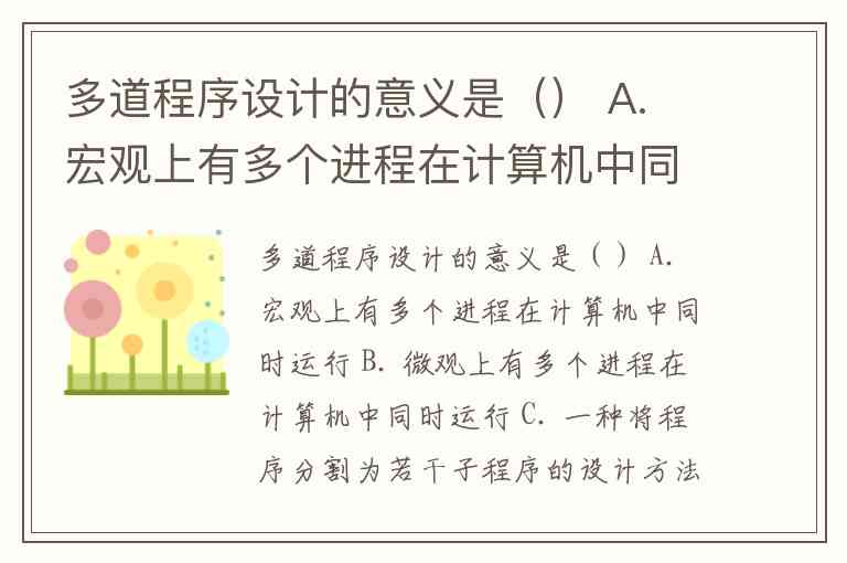 多道程序设计的意义是() A. 宏观上有多个进程在计算机中同时运行 B. 微观上有多个进程在计算机中同时运行 C. 一种将程序分割为若干子程序的设计方法 D. 多个计算机协同运行一个进程