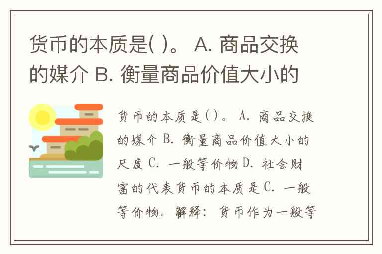 货币的本质是( )。 A. 商品交换的媒介 B. 衡量商品价值大小的尺度 C. 一般等价物 D. 社会财富的代表