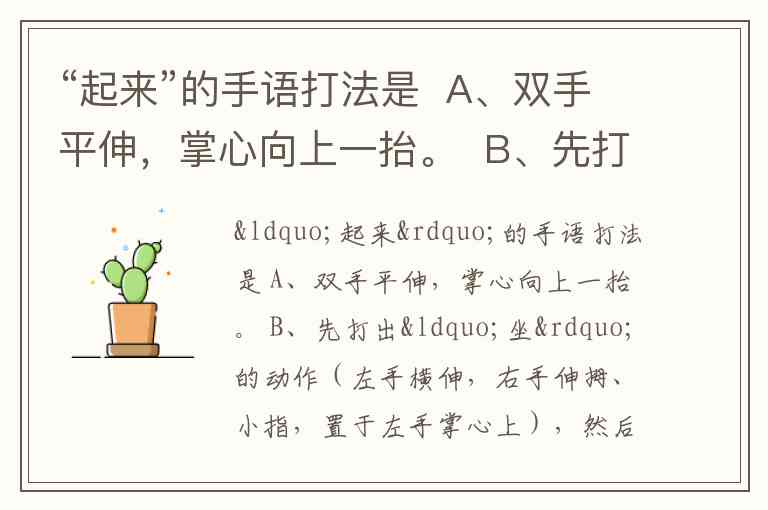 “起来”的手语打法是 A、双手平伸,掌心向上一抬。 B、先打出“坐”的动作(左手横伸,右手伸拇、小指,置于左手掌心上),然后直立,表示站起来。 C、先打出“躺”的动作(左手横伸,右手伸拇、小指,手背向下,置于左手掌心上),然后直立,表示起来。 D、按照词语一字一字打出,“起(双手平伸,掌心向上一抬)”,再加“来”的动作(一手平伸,掌心向下,五指微曲,向内挥动一下)。