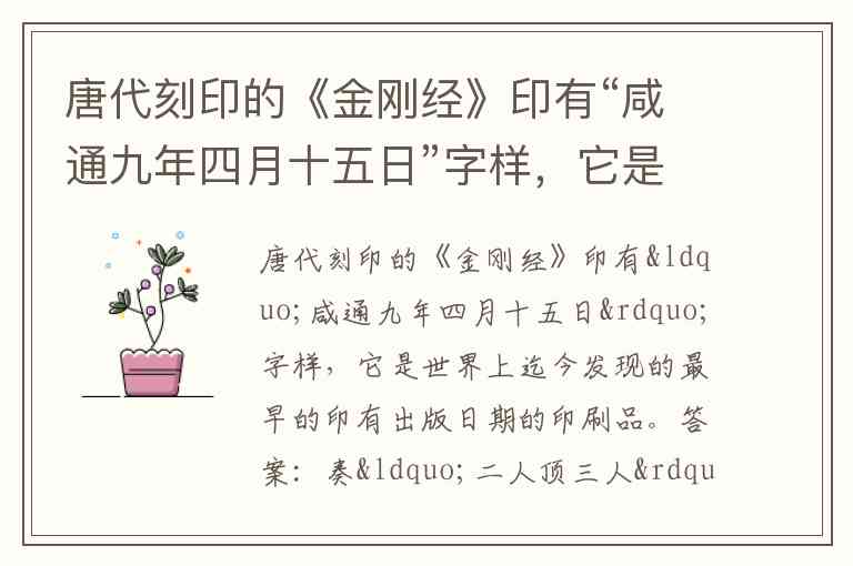 唐代刻印的《金刚经》印有“咸通九年四月十五日”字样,它是世界上迄今发现的最早的印有出版日期的印刷品。