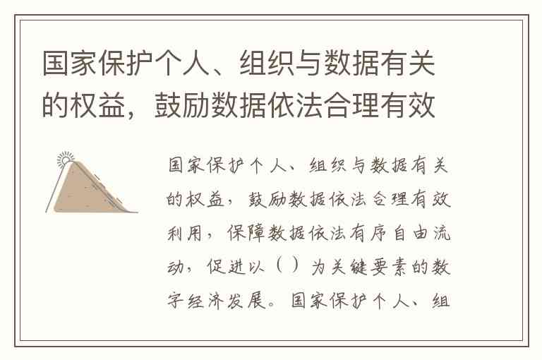 国家保护个人、组织与数据有关的权益,鼓励数据依法合理有效利用,保障数据依法有序自由流动,促进以数据为关键要素的数字经济发展。
