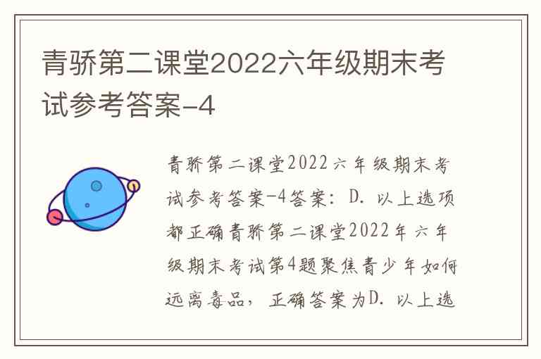 青骄第二课堂2022年六年级期末考试第4题聚焦青少年如何远离毒品,正确答案为D. 以上选项都正确,这一结论综合了预防毒品侵害的核心要素:培养乐观的生活态度能增强心理抵抗力,不结交吸毒和贩毒的朋友可切断接触毒品的途径,养成良好的生活习惯(如规律作息、健康娱乐)则从根本上减少涉毒风险,三者共同构成青少年远离毒品的完整防护体系。