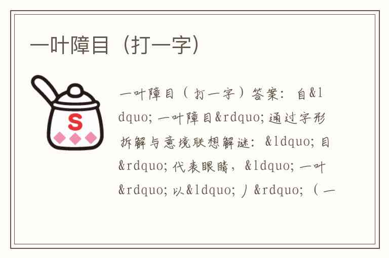 “一叶障目”通过字形拆解与意境联想解谜:“目”代表眼睛,“一叶”以“丿”(一撇,形似叶片)为象征,“障”意为遮挡——“丿”(一叶)遮挡“目”的上部,组合成“自”字。