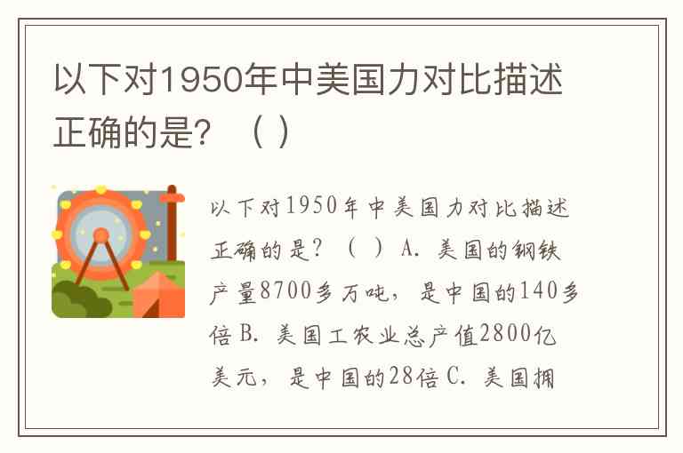 以下对1950年中美国力对比描述正确的是?( ) A. 美国的钢铁产量8700多万吨,是中国的140多倍 B. 美国工农业总产值2800亿美元,是中国的28倍 C. 美国拥有原子弹和世界上最先进的常规武器装备 D. 美国实行的是陆、海、空军立体作战,中国军队以步兵和少量炮兵为主,更无从谈起制空权与制海权