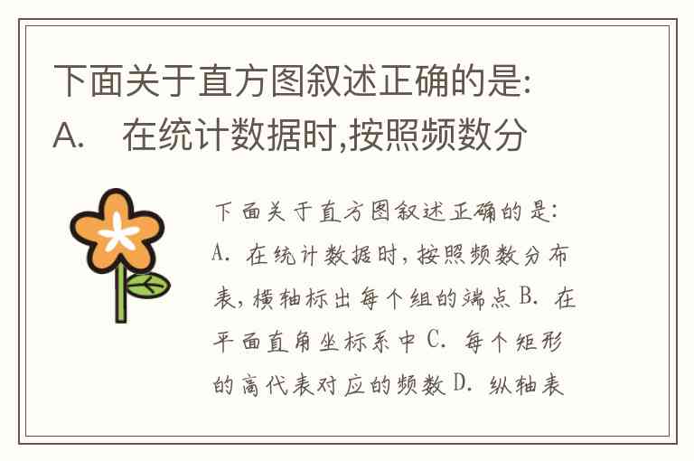 下面关于直方图叙述正确的是: A. 在统计数据时,按照频数分布表,横轴标出每个组的端点 B. 在平面直角坐标系中 C. 每个矩形的高代表对应的频数 D. 纵轴表示频数