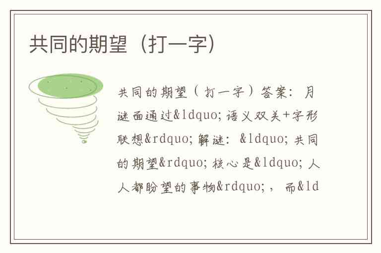 谜面通过“语义双关+字形联想”解谜:“共同的期望”核心是“人人都盼望的事物”,而“月”(月亮)恰是古今中外共通的文化符号——从“但愿人长久,千里共婵娟”的中秋望月,到西方“月神阿尔忒弥斯”的神话,月亮承载着人类对团圆、美好、永恒的共同期望。