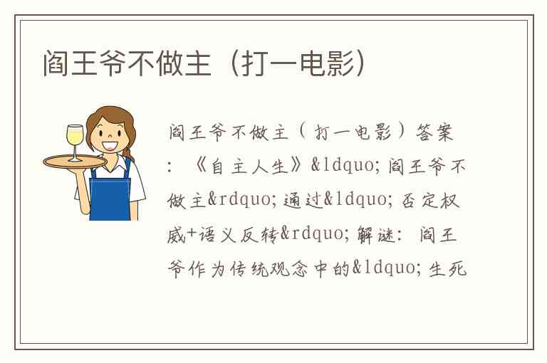 从灯谜手法看,此谜运用“以象征代本体”的借喻技巧——以“阎王爷”代指“外部权威”,以“不做主”代指“拒绝支配”,最终落脚于“自主掌控人生”的积极主题,既符合灯谜“面底呼应”的基本要求,又赋予答案深刻的现实意义,类似“打破常规、追求自由”的电影主题(如《肖申克的救赎》《楚门的世界》),但《自主人生》的“自主”二字与谜面“做主”形成最直接的语义关联。