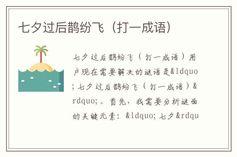 用户现在需要解决的谜语是“七夕过后鹊纷飞(打一成语)”。首先,我需要分析谜面的关键元素:“七夕”、“鹊”、“纷飞”。