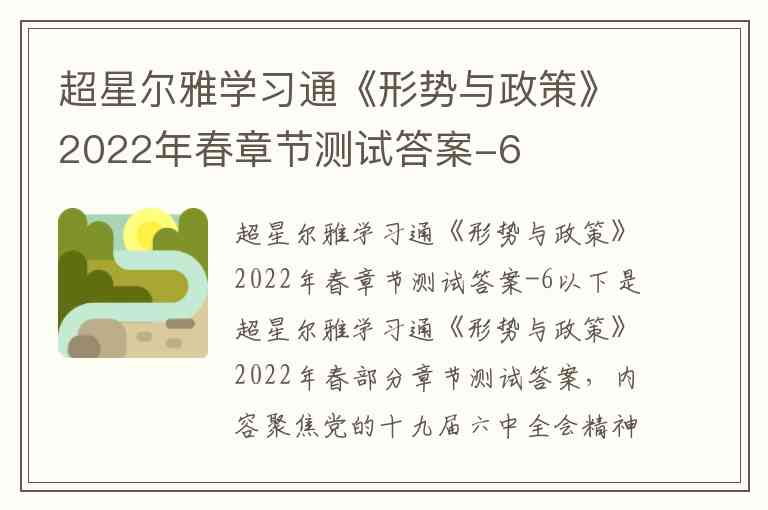 以下是超星尔雅学习通《形势与政策》2022年春部分章节测试答案,内容聚焦党的十九届六中全会精神、马克思主义中国化等核心主题,均来自权威试题资源: